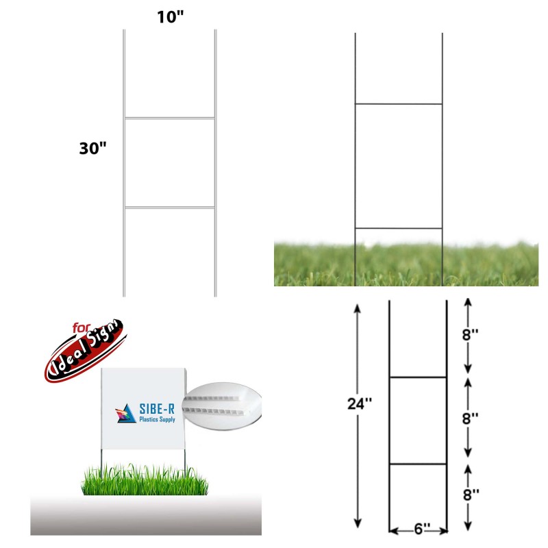 H-Stakes (also known as H-Frames or Step Stakes) are the standard stake used with corrugated plastic signs. These signs have two horizontal "rungs". The bottom run allows for extra leverage when getting your stakes in the ground. They are made out of 9 gauge basic steel and are 30" high and 10" wide OR 24" high and 6" wide. PICK YOU SIZE